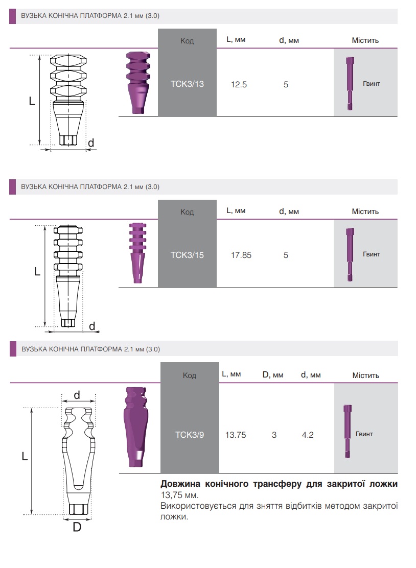 Трансфери для відкритої та закритої ложки для імплантів Alpha Dent з конічною платформою 2.1 мм. Використовуються в ортопедії для зняття сіліконових відбитків.